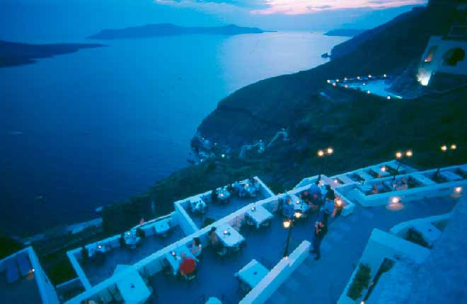 View of Aris restaurant at the caldera cliff. The restaurant operates from inside the hotel loucas.